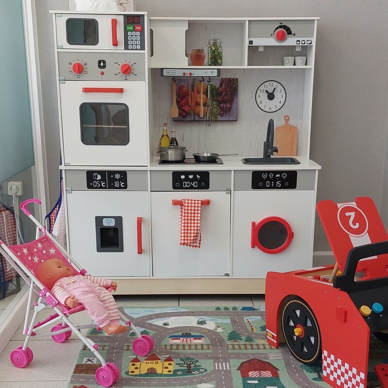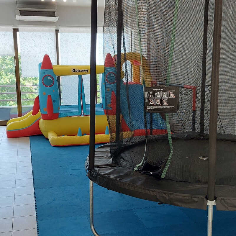 Insuflável, trampolim, baliza, cozinha, carros, bicicletas e parede de giz.